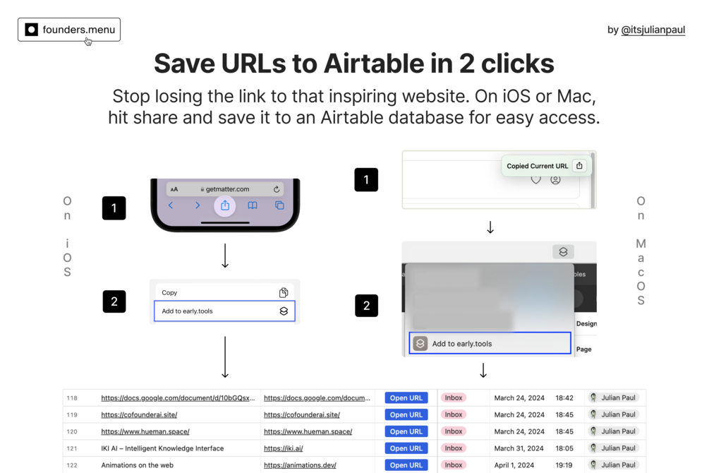 With the tap on the iOS share button, you can access a shortcut that takes the URL you are looking at and safely stores it for you in a specific Airtable database, so you can further curate however you want.