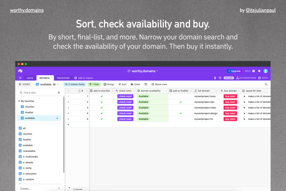 First, you type in the name you are searching for. Then you will automatically be presented with all of the full domains. And all you need to do is check their availability. AND VOILA YOU ARE READY TO BUY!! Right in Airtable.